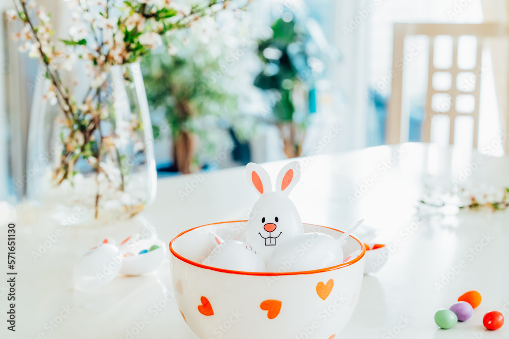 Close up Funny Easter eggs containers with bunny ears filled with candy and chocolate in a bowl on the white kitchen table with blooming branches. Festive spring Easter composition. Selective focus