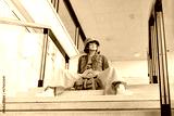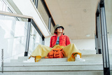 Confident Hipster young woman in bright clothes, sunglasses, backpack bag and bucket hat sitting on the stairs in public place. Urban city street fashion. Fashion blogger. Selective focus. Copy space.
