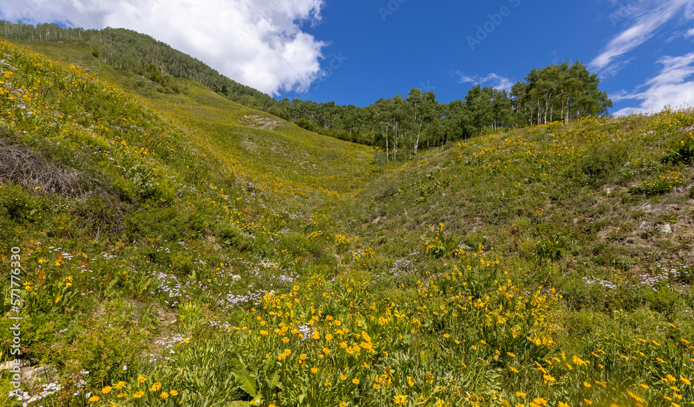 Wildflower meadow in Colorado rocky mountains at Brush Creek trail near Crested Butte.