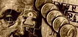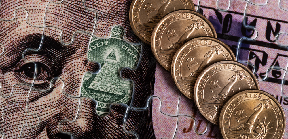 Jigsaw puzzle with a portrait of Benjamin Franklin from a 100 US dollar bill and a fragment of a 1 US dollar bill with a pyramid and an all-seeing eye