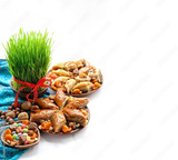 Nowruz festive table. green wheat grass, arabic dessert baklava, sweets, nuts, dry fruits. on white background. Traditional celebration of spring equinox in March, Nowruz Holiday. copy space