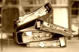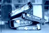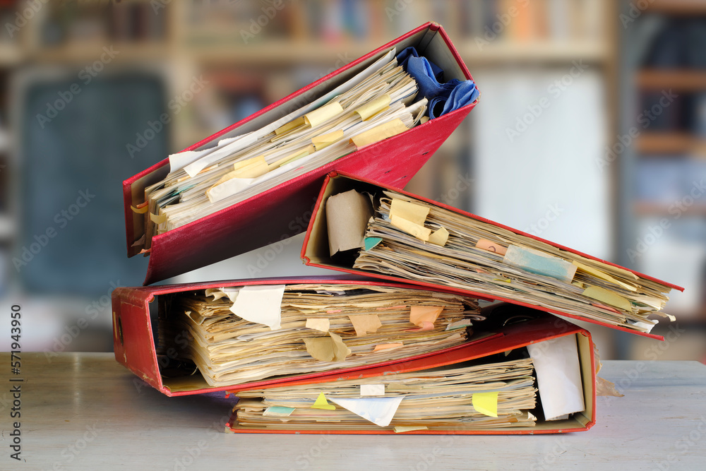 stack of dusty messy file folders with narrow depth of field, blurred office in the back,red tape, bureaucracy,aministration,business concept.