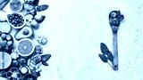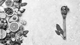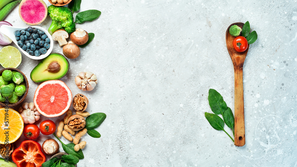 Fresh tasty ingredients for healthy cooking or salad preparation on a rustic background, top view, banner: Fresh Vegetables, Nuts and Fruits. On a stone background. Top view. Copy space.