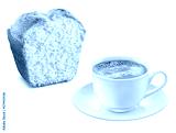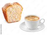 Xícara de café preto e fatia de bolo de baunilha em fundo transparente
