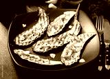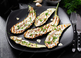 Grilled eggplant and yogurt sauce on a black background. Baked aubergine.