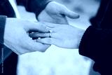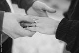 hands of a man and woman after a proposal with close up of a simple diamond ring