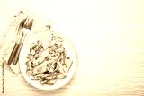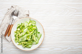 Healthy vegan green avocado salad bowl with sliced cucumbers, edamame beans, olive oil and herbs on ceramic plate top view on white wooden rustic table background. Space for text