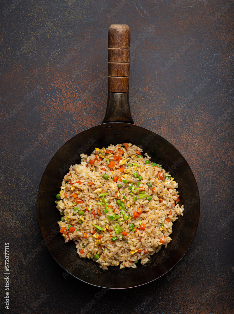 Authentic Chinese and Asian fried rice with egg and vegetables in wok top view on rustic concrete table background. Traditional dish of China