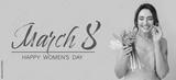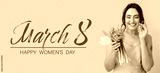 Greeting card for 8 March with beautiful young woman holding flowers on beige background