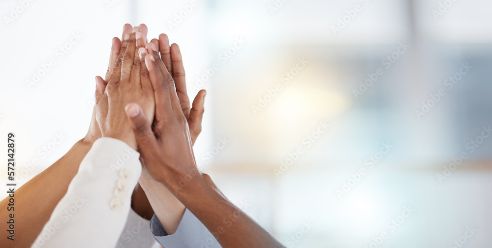High five, business team and collaboration success of staff in office with mock up. Company, staff and hands together for solidarity, motivation and support with blurred background and mockup