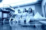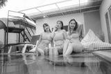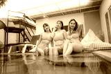 Asian three young sexy woman wearing a yellow bikini Playing in the pool at Pool Villa