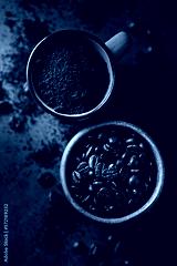 Coffee beans and ground coffee in ceramic cups. Top view. Copy space