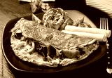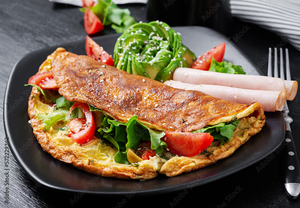 Keto breakfast. Omelette tomato, olives and avocado, ham. Ketogenic diet. Low carb high fat breakfast. Healthy food concept.