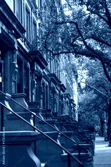 Autumn view of Row of beautiful upscale New York City apartment building homes with colorful trees