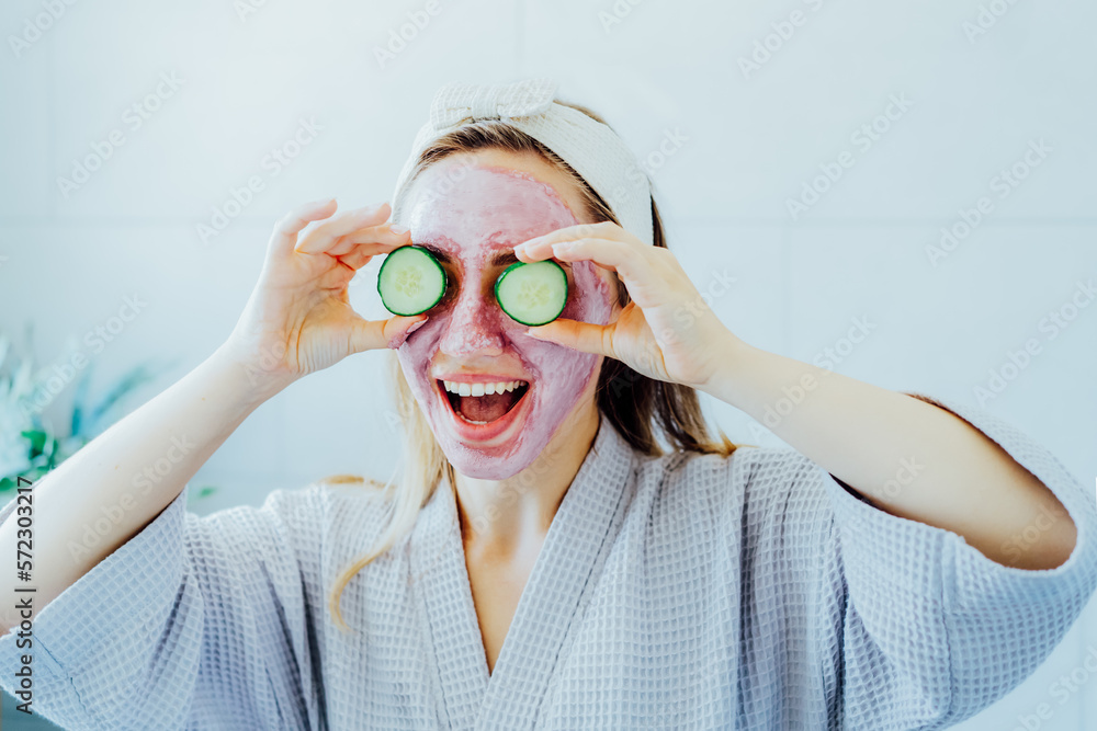 A young smiling woman with pink clay facial mask holds cucumber slices making a refreshing eye mask in bathroom. Natural cosmetic procedures for skin care at home. Beauty self-care. Selective focus.