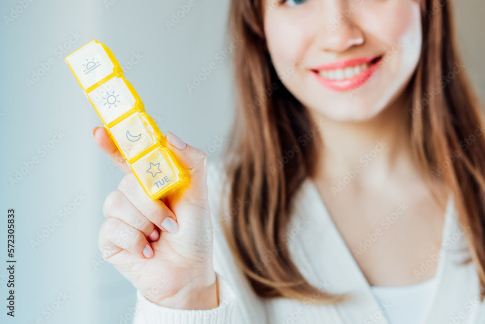 Smiling young woman holding daily pills organizer. Taking daily medicine antioxidant diet vitamin supplements for beauty skin hair health care medicament biohacking concept. Selective focus,