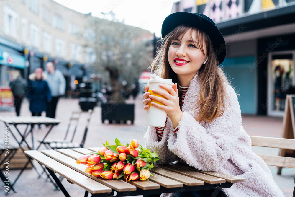 Stylish young smiling woman enjoying coffee from a reusable cup, listening to music, podcast using wireless earphones in a street cafe. Fresh tulips bouquet on the table. Springtime street fashion