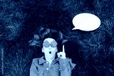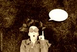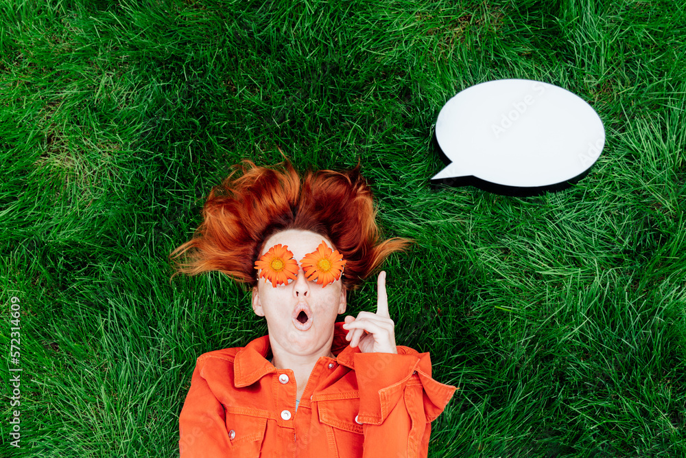 Astonished, surprised redhead Woman with red orange gerbera Flower glasses get incredible idea raise index finger up and blank copy space thought cloud on green grass. Positive Emotion. Fashion
