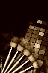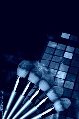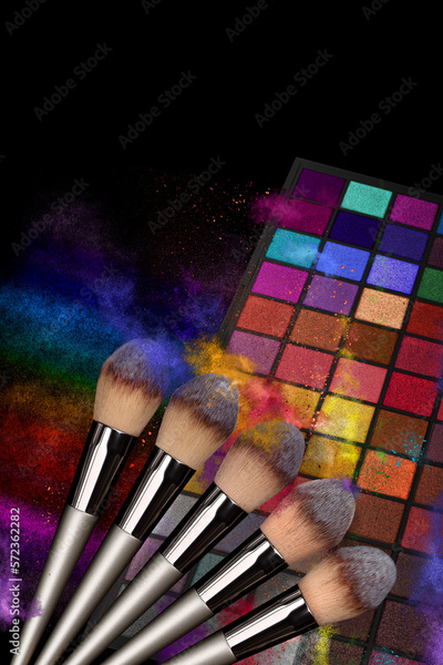 Bright eye shadow, blush brushes, explosion of multicolored powder dust on black background. Highly vibrant color-pressed pigment palettes for make-up. Abstract background for cosmetic concept.