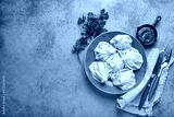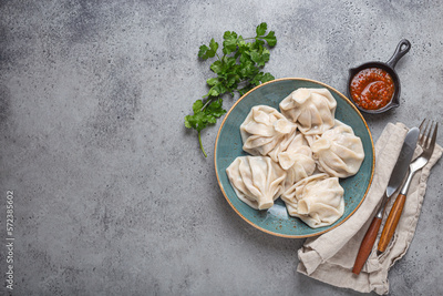 Georgian dumplings Khinkali on plate with red tomato sauce and fresh cilantro top view on rustic stone background, traditional dish of Georgia. Space for text