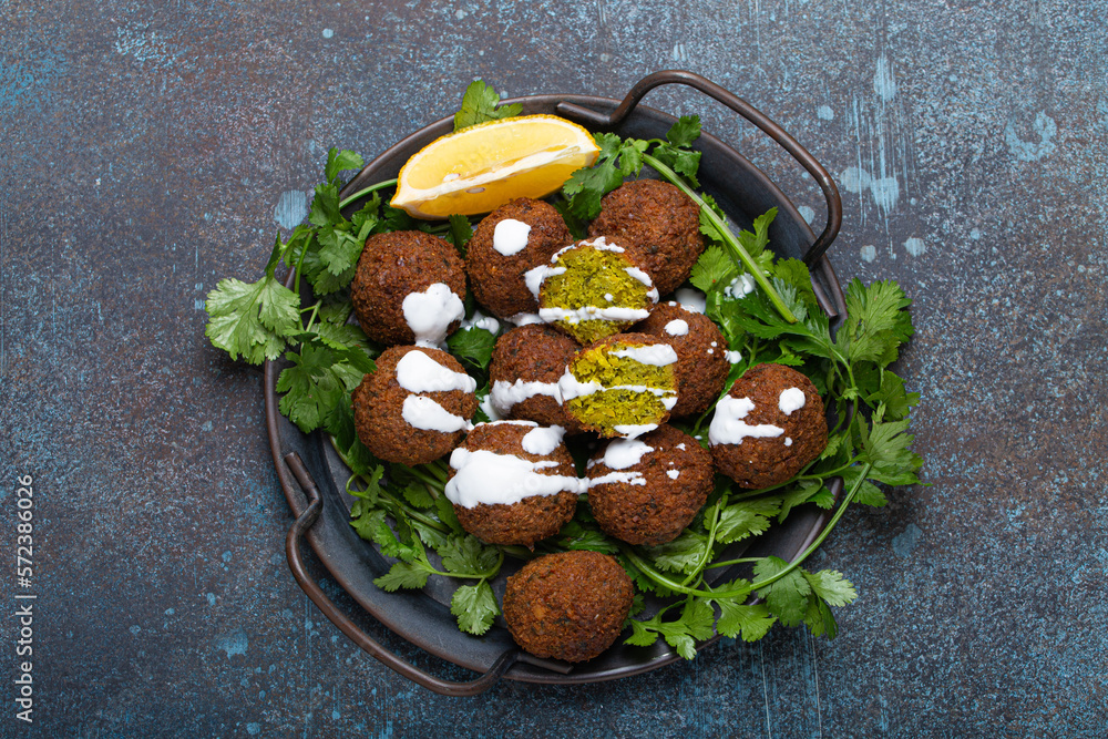 Plate of fried falafel balls served with fresh green cilantro and lemon top view on rustic concrete background. Traditional vegan dish of Middle Eastern cuisine