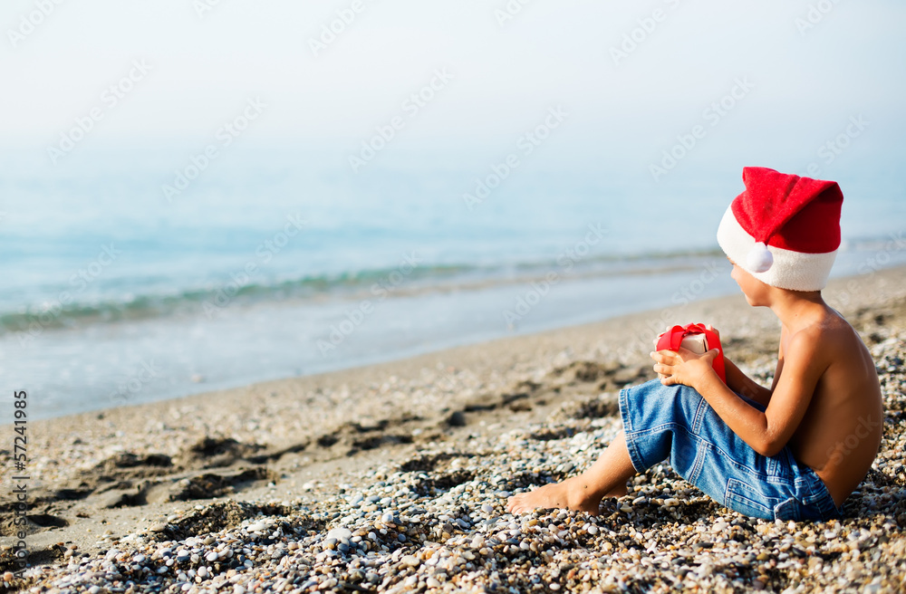 Boy in Christmas hat next to the sea