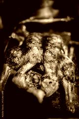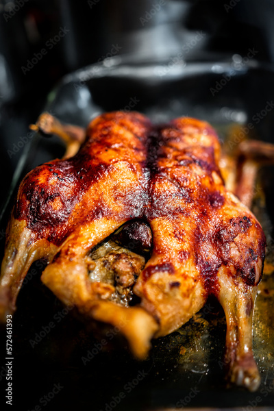 Whole roasted duck poultry bird closeup vertical view on in glass pan for baking with crispy brown golden skin macro with texture
