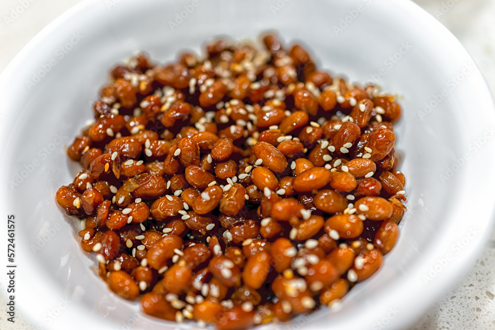 Asian Japanese soybeans macro closeup with sesame seeds and soy sauce natto fermented soy dish meal in bowl plate
