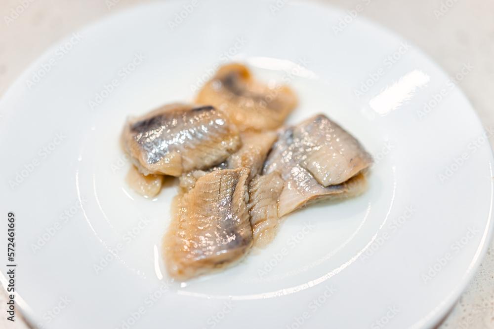 Pickled wild caught herring pieces macro closeup with texture of fillets on white plate studio shot as traditional Eastern European food