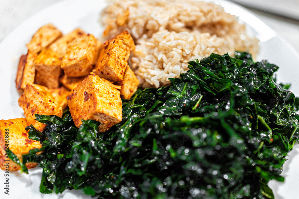 Homemade curry tofu closeup of cubes with massaged kale salad and brown rice on white plate as healthy vegan food