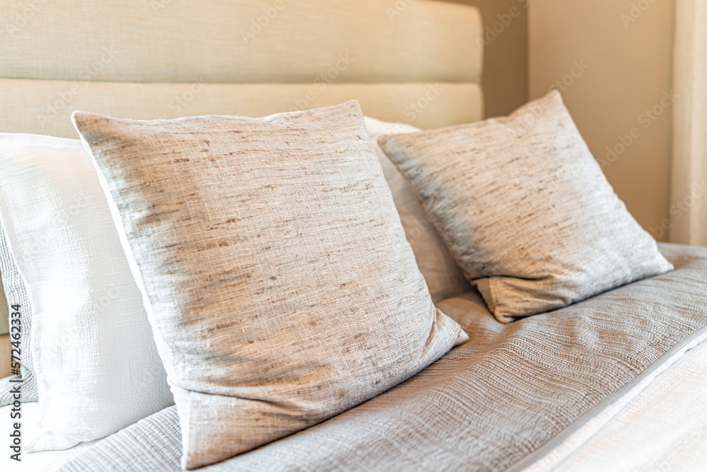 Bedroom room interior with bed furniture and nobody in modern luxury apartment home house with beige neutral pillows and natural light