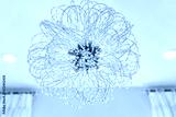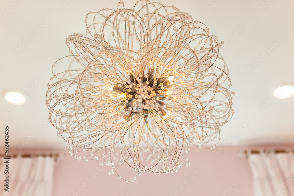 Modern ceiling lamp lantern light closeup in pink home house room illuminated lit with contemporary design decoration with crystal beads