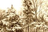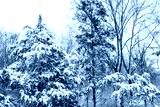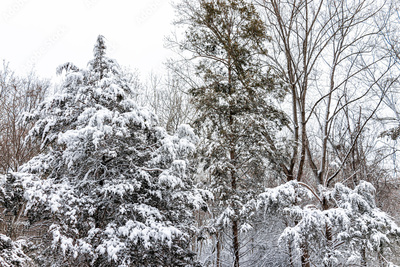 Trees in forest high angle view pattern with snow covered evergreen juniper pine trees during blizzard white storm in northern Virginia winter