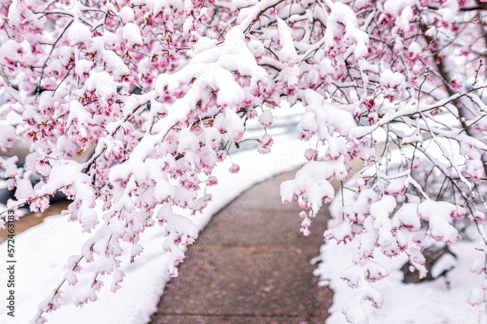 Snow covered weeping sakura tree with cherry blossoms frozen on branch in northern Virginia sidewalk near Washington DC with pink petal flowers