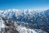 Mountains resort Amirsoy. Sun and fog landscape of Western Tien Shan. Ski tourism of Uzbekistan.