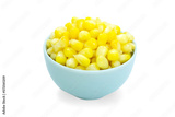 Boiled corn seed full of on light blue cup isolated on white background.File contains clipping path.