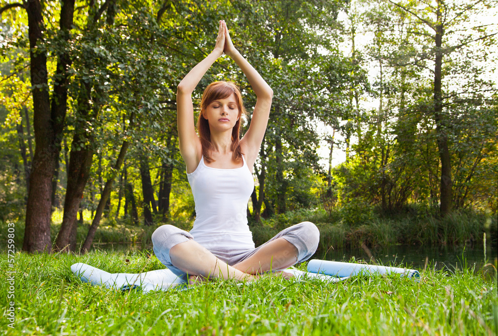Young girl doing yoga (lotus pose) in the park