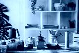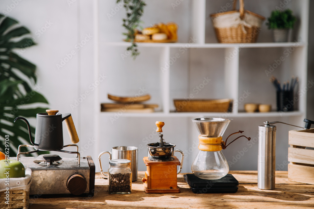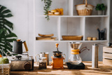 Couple or asian people to smell coffee bean, make or brew coffee in kitchen home. Include cup, mug, bottle and kitchenware on table. Concept for morning lifestyle, love, happy, family, relationship.