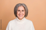 Portrait photo of cheerful positive satisfied mature aged lady white teeth smiling wear warm turtleneck sweater isolated on beige color background