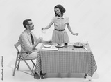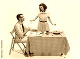 Monochrome portrait of family couple sitting at the table, having breakfast. Woman caring after man. Concept of love, relationship, retro style