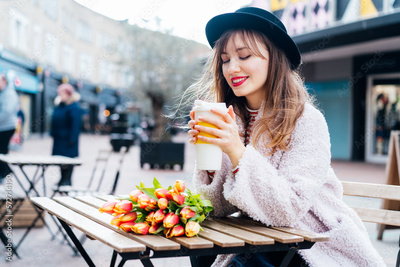 Portrait of stylish young woman enjoying coffee from a reusable cup at the table of European street cafe, smiling and dreaming. Fresh tulips bouquet on the table. Springtime street fashion.