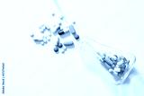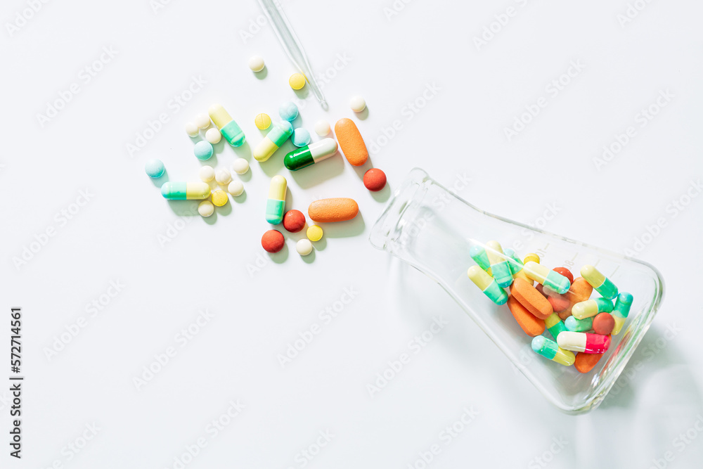 Medical: Pills and bottle, aerial view ,drug trials and pill bottles,science experiment flask