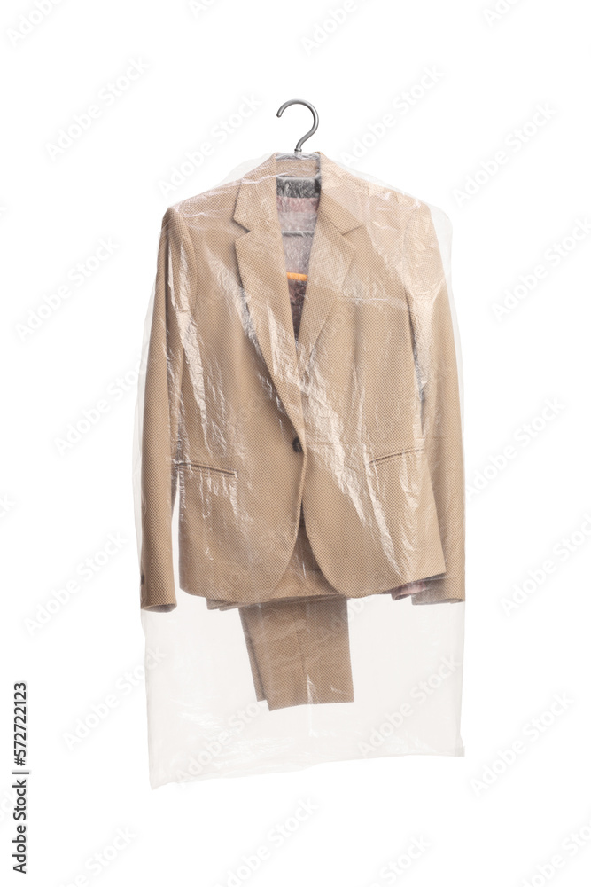 Beige female suit on a hanger with a plastic dry cleaning bag