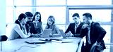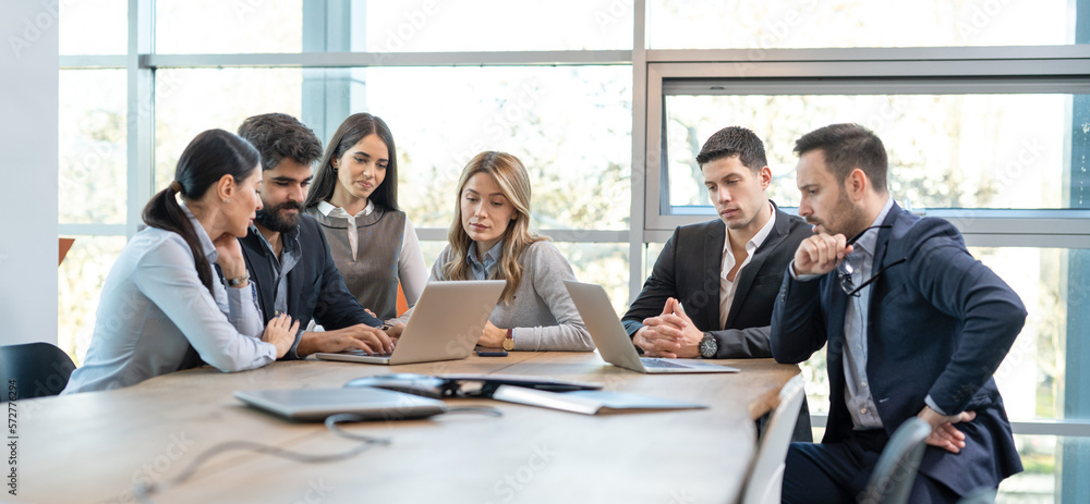 Group of business people on a meeting in office. Focused partners looking at laptops and planning new business strategy.