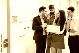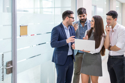 Group of business team with laptop discussing project and sharing ideas during meeting indoors. Copy space available.