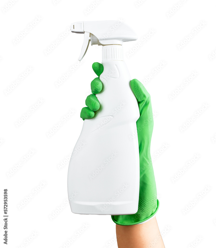 Hand in glove holding spray bottle mockup, liquid chemical in blank sprayer package mock up isolated on white background