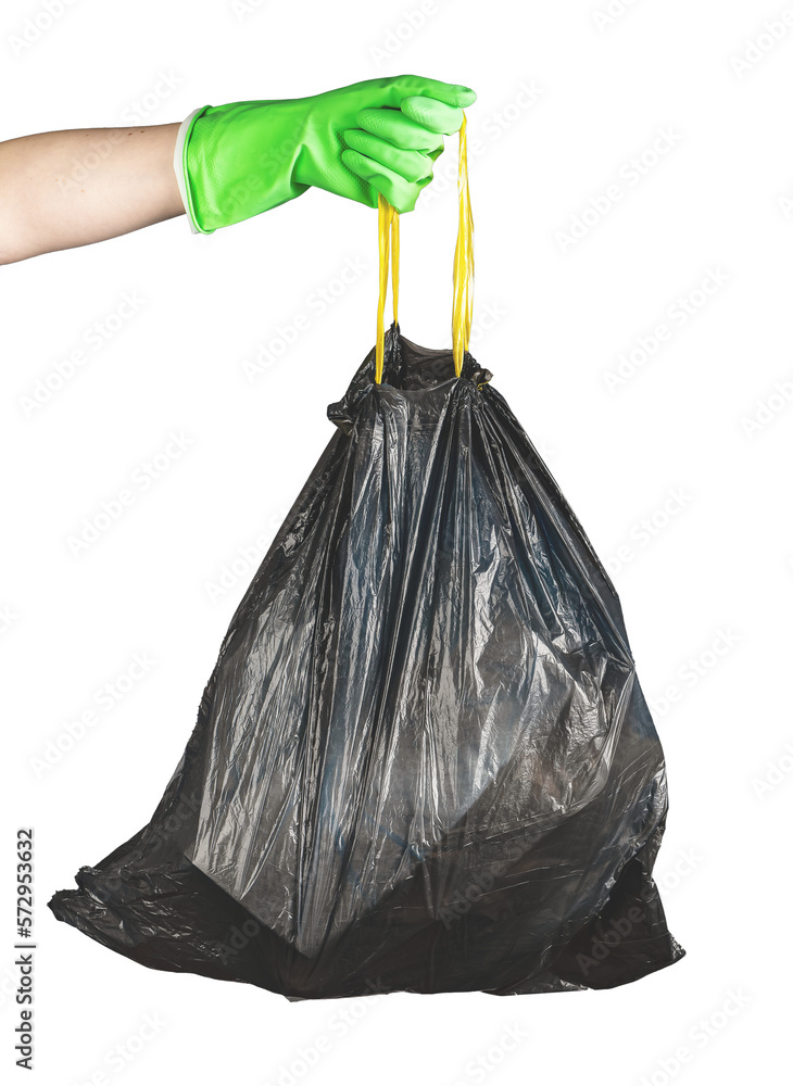 Hand in glove holding handles of black disposable garbage bag, trash sack full of rubbish isolated on white