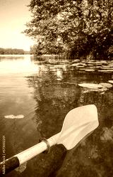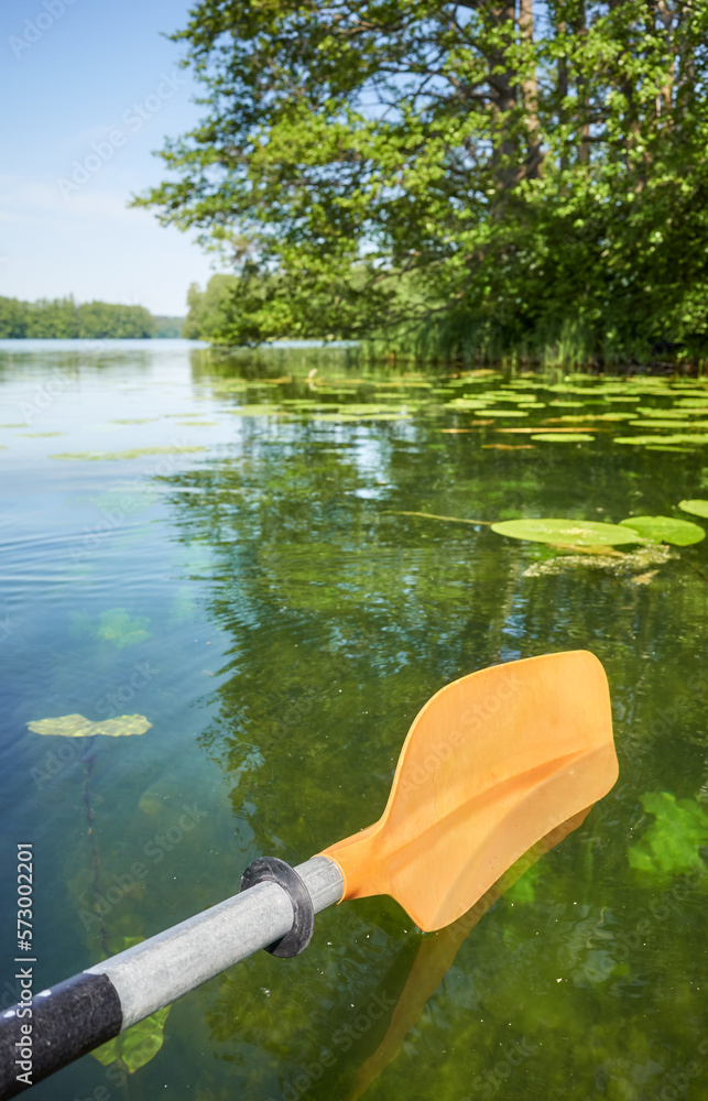 Kayak paddle in the water, selective focus.