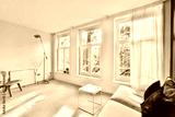 a living room with white walls and wood flooring, two large windows in the wall is covered with sheer curtains