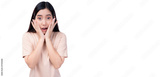 Surprised happy beauty asian woman looking camera in excitement Expressive facial expressions Presenting a product Beautiful girl act like a confused something Isolated on white background copy space